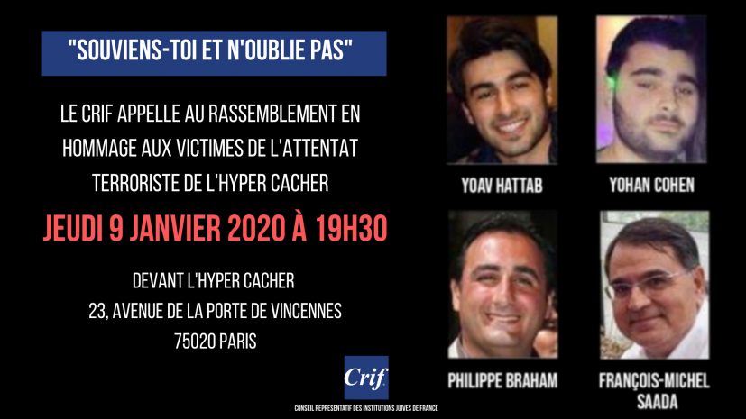 Soyons nombreux, le jeudi 9 janvier 2020 devant l’hyper cacher de la porte de Vincennes. En cette date anniversaire,  venons témoigner et dire que nous n’oublions pas et que nous n’oublierons  jamais Philippe Braham, Yohan Cohen, Yohav Hatab et François Michel Saada victimes de la haine anti juive et du terrorisme islamiste.