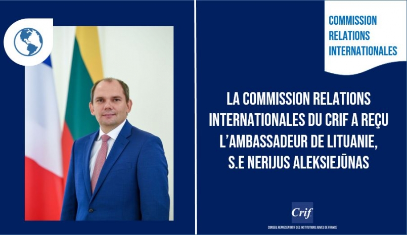 La commission Relations Internationales du Crif a reçu aujourd’hui S.E. Nerijus Aleksiejūnas, l’ambassadeur de Lituanie. Après une brève introduction présentant son pays et l’histoire des juifs en Lituanie, l’ambassadeur a répondu aux questions des membres de la commission.