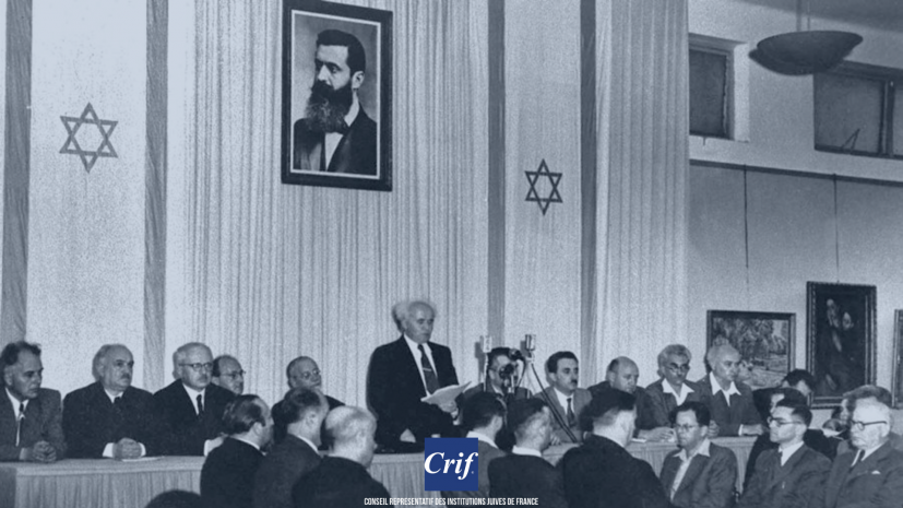 "Nous sommes solennellement réunis, nous, les membres de l'assemblée du peuple, représentants des juifs de Palestine et du mouvement sioniste, en ce jour de la cessation du mandat britannique. En vertu de nos droits naturels et historiques et de la résolution des Nations unies, nous proclamons la création d'un État juif sur la terre d'Israël".