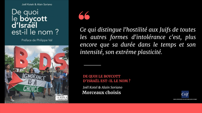 Cette semaine, découvrez les bonnes pages du livre « De quoi le boycott d’Israël est-il le nom ? » de Joël Kotek et Alain Soriano. Les deux auteurs ont participé à la récente Conversation du Crif, hier soir, sur la page Facebook du Crif.