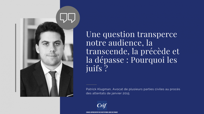 Maître Patrick Klugman est avocat de parties civiles, victimes de la prise d’otages de l’Hyper Cacher, au procès des attentats de janvier 2015. Jeudi 3 et vendredi 4 décembre 2020, les différents avocats des parties civiles ont présenté leurs plaidoiries. Découvrez l’intégralité de la plaidoirie de Me Patrick Klugman axée sur le mobile antisémite.