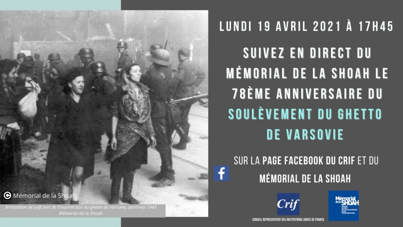 Ce soir à 17h45, se déroulera en direct sur notre site et sur la page Facebook du Crif, la cérémonie commémorant le 78ème anniversaire du soulèvement du Ghetto. Pour assister à la cérémonie, rendez-vous sur notre page Facebook, ou dans cet article.