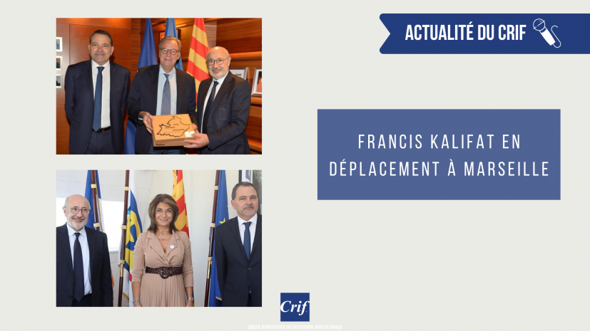 Fin octobre, le Président du Crif Francis Kalifat s’est rendu à Marseille où il a rencontré le président régional Bruno Benjamin, les dirigeants du Crif Marseille-Provence, ainsi que les personnalités politiques locales.
