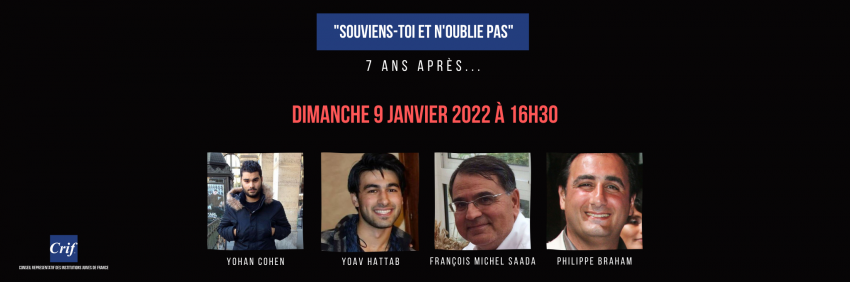 Soyons nombreux, le dimanche 9 janvier 2021 devant l’hyper cacher de la porte de Vincennes. En cette date anniversaire, venons témoigner et dire que nous n’oublions pas et que nous n’oublierons jamais Philippe Braham, Yohan Cohen, Yohav Hatab et François Michel Saada victimes de la haine anti juive et du terrorisme islamiste.