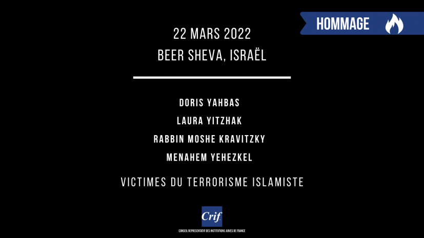 Mardi 22 mars, quatre israéliens ont perdu la vie, victimes d’un terroriste islamiste, à Beer Sheva, dans le sud d’Israël. Le Président du Crif Francis Kalifat a exprimé ses condoléances à leurs proches.