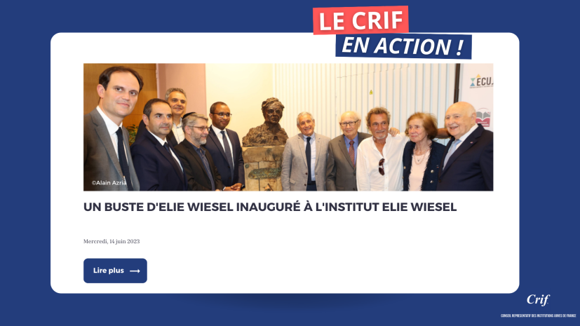Le mardi 6 juin dernier, l’inauguration du buste d’Élie Wiesel dans le hall d’entrée de l’Institut d’études juives qui porte son nom rappelait symboliquement que depuis sa création il y a 18 ans, avec son soutien et sous son parrainage, l’établissement s’inscrit dans ses pas, fidèle au message qu’il a toujours porté. En effet, seule institution française entièrement consacrée à l’enseignement supérieur de la civilisation du judaïsme, elle couvre, dans une vision transdisciplinaire, l’ensemble des champs de l’histoire, de la pensée et de la culture de la civilisation d’Israël.  « À ce titre, en acceptant qu’il porte son nom, Elie Wiesel a donné à notre Institut sa légitimité et ses fondements.  Celui qui a reçu le prix Nobel de la Paix en 1986 a été une conscience juive pour l’Humanité tout entière » rappelait le Président du lieu Yves Rouas dans son discours prononcé pour l’occasion. Poursuivant en mentionnant que « sa référence aux Textes de la Tradition juive lui donnait la force de l’universalisme », avant de citer un extrait d’Entre deux soleils (Seuil, 1970) :  « Je n’admets pas la distinction qu’on a coutume de faire entre l’homme juif et l’homme tout court. Un Juif qui œuvre pour son peuple, loin de se retrancher de l’Humanité, œuvre aussi pour elle » .