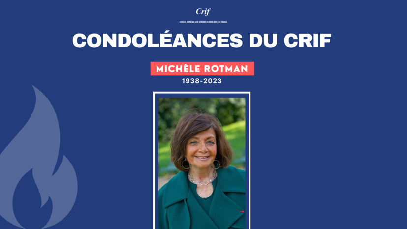 Le Président du Crif et le Crif présentent ses sincères condoléances à la famille et aux proches de Michèle Rotman, membre active de la communauté juive. Elle a notamment été vice-Présidente du Consistoire de Paris, organisatrice de la journée européenne de la culture juive, membre active de Morial et du Crif.