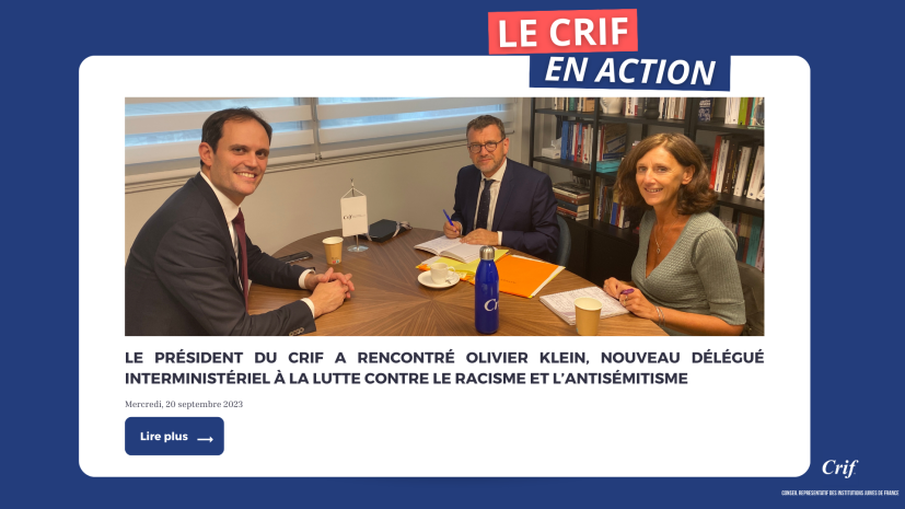 Ce mardi a eu lieu une rencontre entre le Président du Conseil représentatif des institutions juives de France (Crif) et le nouveau délégué interministériel à la lutte contre le racisme et l’antisémitisme, qui succède à la préfète Sophie Elizeon. Il s’agissait d’un entretien nécessaire pour permettre au Crif et à la Déléguation interministérielle à la lutte contre le racisme, l'antisémitisme et la haine anti-LGBT (Dilcrah) de consolider leur coopération et de s’accorder sur les différents combats à mener.