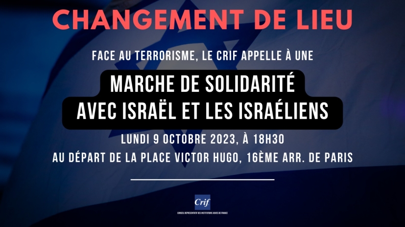 Le Crif, les institutions juives et tous les amis d’Israël vous donnent rendez-vous lundi 9 octobre 2023 à 18h30 pour un départ place Victor Hugo, à Paris pour une marche de solidarité avec Israël et les Israéliens.