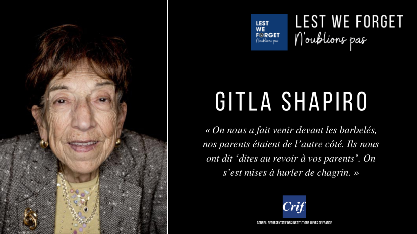 C’est avec une profonde tristesse que nous avons appris le décès de Gitla Shapiro, âgée de 91 ans, à Jérusalem, le 19 novembre 2023. À l’âge de 10 ans, Gitla est arrêtée avec sa famille, le matin du 16 juillet 1942 : c’est la Rafle du Vél d’Hiv. Gitla nous a fait l’honneur de participer à l’exposition réalisée par le Crif « Lest We Forget – N’oublions pas 2022 », à l’occasion des 80 ans de la Rafle du Vél d’hiv. Le Crif adresse ses plus sincères condoléances à toute sa famille et à sa sœur Sarah. Nos pensées émues vous accompagnent.