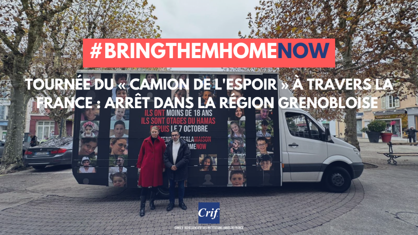 Lundi 27 novembre 2023, le « camion de l'Espoir » est arrivé à Grenoble, accueilli par le Président du Crif Grenoble-Dauphiné, Hervé Gerbi. Le camion, recouvert des visages des otages retenus par le Hamas dans la bande de Gaza a traversé la région grenobloise, de Voiron à Grenoble, au Grésivaudan et au Vercors. Le Président du Crif Grenoble-Dauphiné, Hervé Gerbi a suivi le camion tout au long de son itinéraire dans la région, à la rencontre des élus et des habitants.