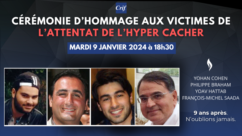 Le Crif rendra hommage aux victimes de l’Hyper Cacher, mardi 9 janvier 2024, à 18h30. La cérémonie est ouverte au public. Soyons nombreux à leur rendre hommage.