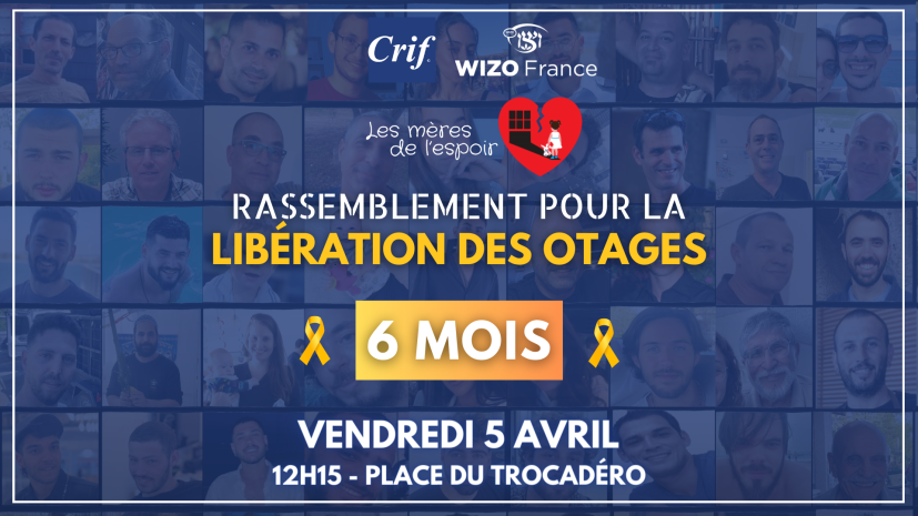 Depuis le 17 novembre 2023, les Mères de l’Espoir se réunissent chaque vendredi Place du Trocadéro à Paris pour demander la libération de tous les otages retenus par le Hamas dans la bande de Gaza. Le 7 avril, cela fera six mois que 134 enfants, femmes et hommes sont retenus en otage par le Hamas dans la bande de Gaza. Le Crif et la Wizo vous donnent rendez-vous le 5 avril à 12h15 Place du Trocadéro pour appeler à leur libération.