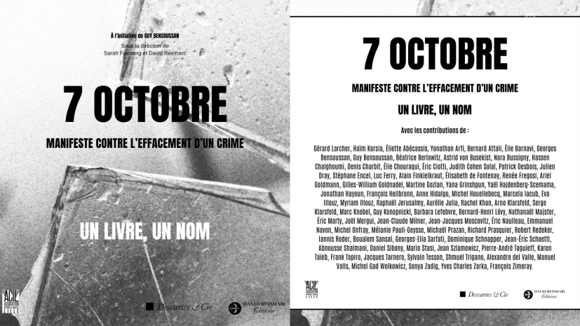 7 octobre. Manifeste contre l’effacement d’un crime est un ouvrage mené à l’initiative de Guy Bensoussan, sous la direction de Sarah Fainberg et David Reinharc. Dans ce manifeste, 80 personnalités, dont le Président du Crif, Yonathan Arfi, s’érigent contre les silences autour des massacres du 7 octobre et le refus de les voir pour ce qu’ils sont : un crime contre l’humanité à visée génocidaire.