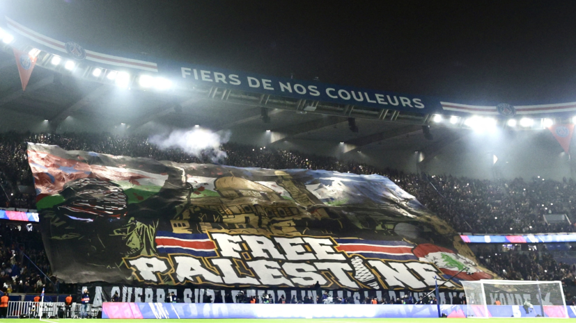 Mercredi 6 novembre 2024 au soir, La Tribune Auteuil du Parc des Princes s’est vu revêtir d’une très large banderole représentant notamment un combattant palestinien masqué, et une carte où l’État d’Israël n’existe plus.