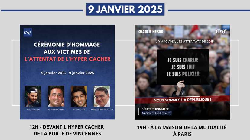 Comme chaque année, le Crif organise une cérémonie d’hommage devant l’Hyper Cacher de la Porte de Vincennes à 12h. À 19h, à la Maison de la Mutualité à Paris, Charlie Hebdo et le Crif organisent une soirée de débats et d’hommage pour retrouver l’esprit de la manifestation du 11 janvier 2015 et réaffirmer un engagement républicain partagé pour la liberté d’expression, contre l’antisémitisme et l’islamisme, pour la laïcité.