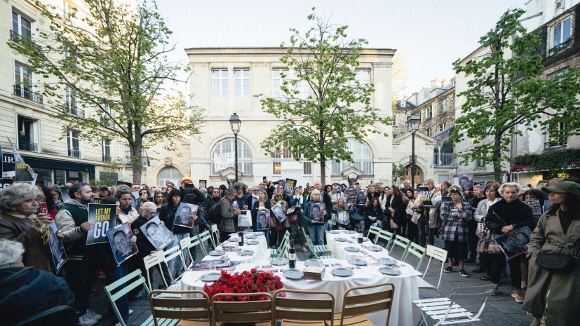 À l’initiative du collectif Tous7octobre, une grande table de Pessah était dressée lundi 7 avril 2025 à Paris, Place des 260 enfants, pour appeler à la libération immédiate des 59 otages retenus depuis 18 mois par le Hamas dans la bande de Gaza.