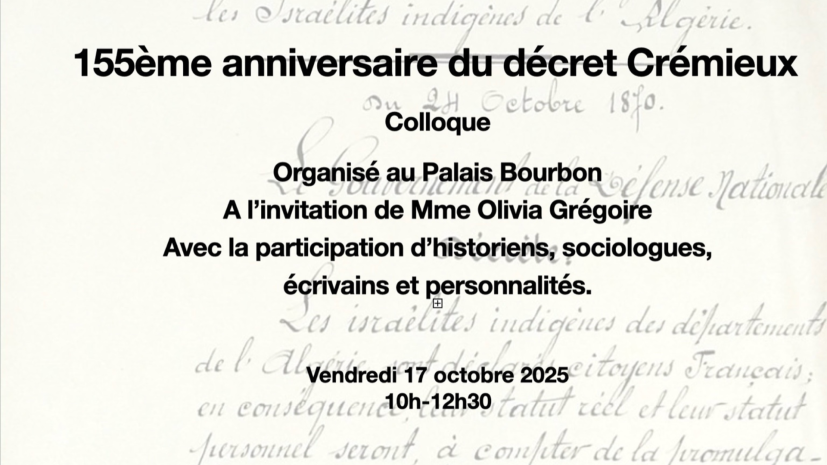 Le 17 octobre 2025, à l’invitation de Madame Olivia Grégoire, aura lieu lieu un colloque de célébration du 155e anniversaire du décret Crémieux et de la naturalisation des Juifs d’Algérie, au Palais Bourbon à Paris.