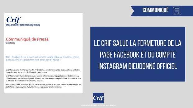 Le 3 août 2020, Facebook a annoncé la suppression de la page de Dieudonné, ainsi que celle de son compte Instagram, pour « discours de haine ». Le Crif a accueilli avec satisfaction cette décision. Depuis, le réseau social TikTok a également annoncé la fermeture du compte de Dieudonné sur sa plateforme. Le combat contre la haine sur Internet continue.