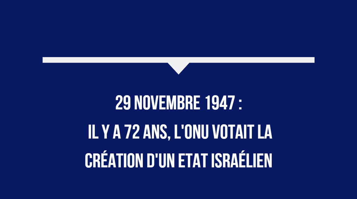 Le 29 novembre 1947, il y a 72 ans, était votée, à l’assemblée générale de l’ONU à New York, la résolution 181. Le plan de partage de la Palestine mandataire en trois entités : création d’un État arabe, Jérusalem et un État juif. Ce plan accepté par les dirigeants de la communauté juive est immédiatement rejeté par la quasi-totalité des dirigeants arabes qui annoncent leur intention d’attaquer l’État juif dès sa création.