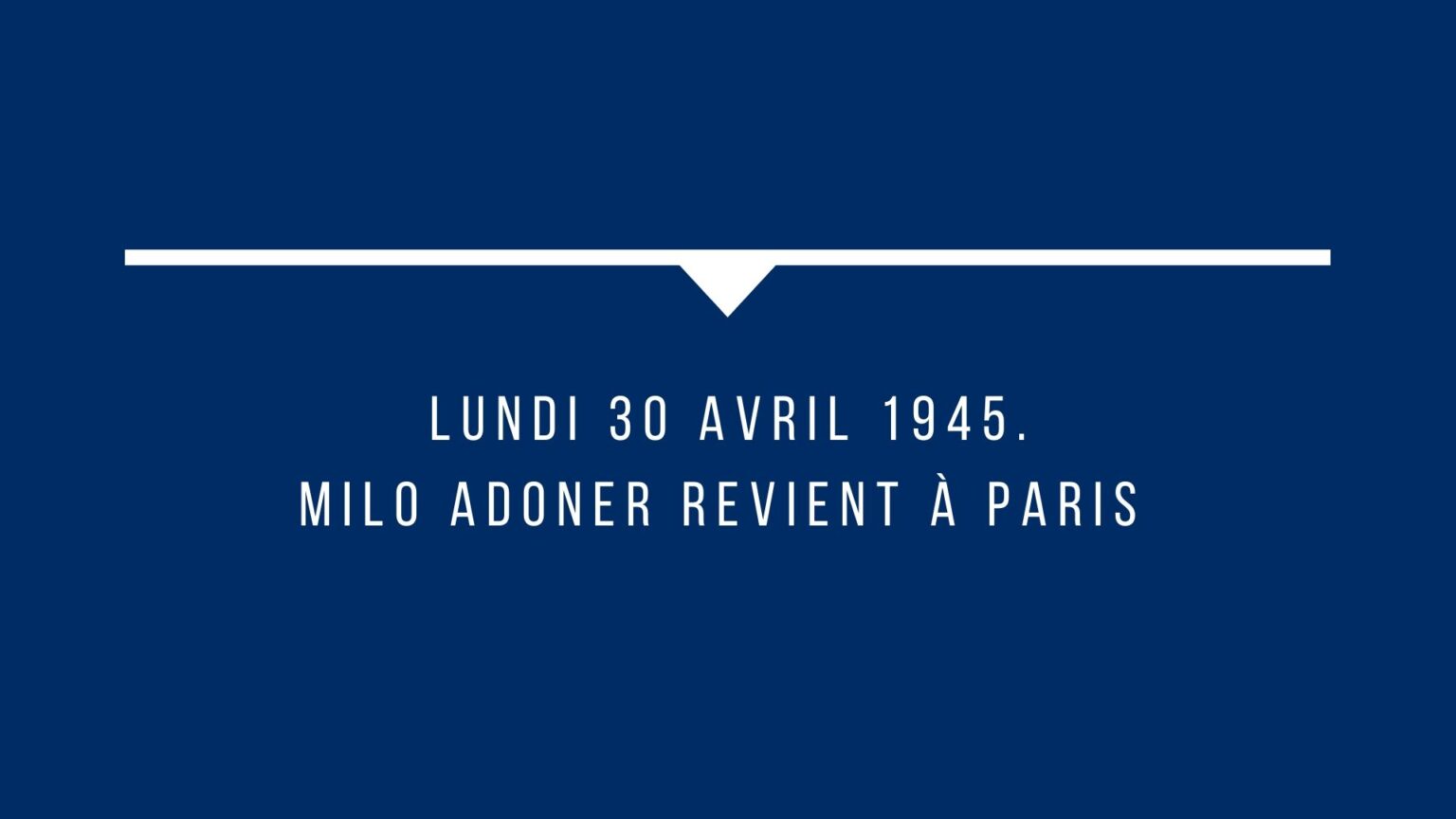 Milo récupère le logement familial. En tant que déporté, il reçoit par Gouvernement, une chaise, un lit, une table en bois blanc et 1800 euros en guise de compensation pour la spoliation de tous les biens familiaux. Milo Adoner est envoyé dans un sanatorium où il restera trois années. Il a fondé une famille avec une fille de déporté. Lui qui avait obtenu le Certificat d’Etudes avec mention en 1937 deviendra représentant en horlogerie puis vendeur des jeans aux puces de Clignancourt.