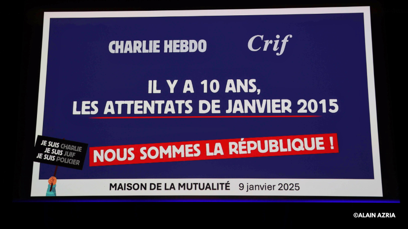 Dix ans après, plus de 1 500 personnes et de nombreuses personnalités publiques et politiques, étaient présentes jeudi 9 janvier 2025 à la Maison de la Mutualité pour assister à une grande soirée de débats et d'hommage organisée par Charlie Hebdo et le Crif pour retrouver l'esprit de la manifestation du 11 janvier 2015 et réaffirmer un engagement républicain partagé pour la liberté d'expression, contre l'antisémitisme et l'islamisme, pour la laïcité.