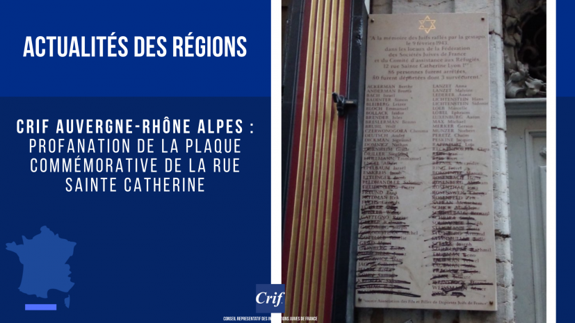 C’est avec la plus grande tristesse que nous avons appris en ce jour d’octobre, en pleine période de fêtes juives, la nouvelle profanation de la plaque commémorative de la rue Sainte Catherine, plaque qui porte gravée dans la pierre le nom de ces 86 juifs raflés par la gestapo aux ordres de Barbie.