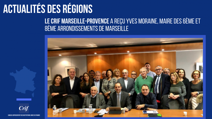 Le Maire des 6ème et 8ème arrondissements de la ville de Marseille, Yves Moraine, a été reçu au Crif Marseille-Provence. Le Président du Crif Marseille-Provence, Bruno Benjamin, était présent.