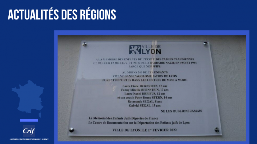 La semaine du 7 février 2022, plusieurs cérémonies et poses de plaques commémoratives en mémoire d’élèves juifs scolarisés dans des établissements de la Métropole de Lyon ont eu lieu à l’initiative du Centre de Documentation sur les Enfants Déportés Juifs de Lyon (CDDEJ). En partenariat avec le Crif, à travers ses représentants en région Auvergne Rhône-Alpes.