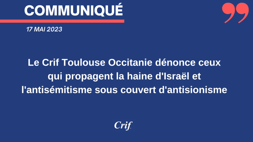 Le Crif Toulouse Occitanie est et sera toujours en première ligne pour dénoncer ceux qui propagent la haine d'Israël ainsi que l'antisémitisme sous couvert d'antisionisme, et ceux qui les laissent agir en totue impunité.