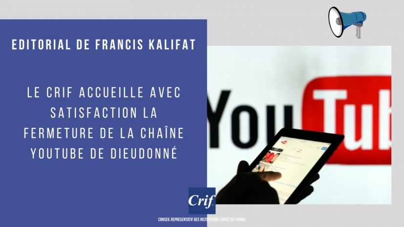 Si il accueille avec satisfaction la fermeture de la chaîne YouTube de Dieudonné, le Crif attend aussi de la plateforme comme de toutes les autres qu’elles poursuivent ce travail d'assainissement du Net en supprimant les contenus et les chaînes antisémites, racistes, homophobes, négationnistes et islamistes qui y pullulent. Nous restons vigilants et intransigeants.